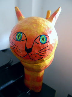 Um gato de papier mâché que comprei no Natal passado numa feirinha solidária. Foi feito por crianças deficientes e eu acho-o lindo! Chama-se Horácio, em honra do Horatio Caine, como todos os gatos ruivos, para mim :)